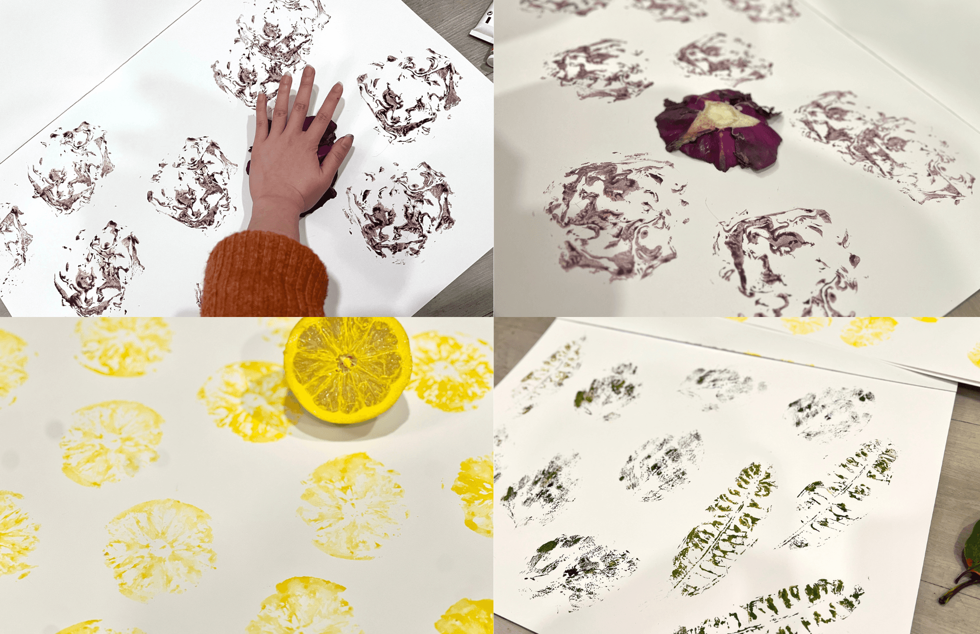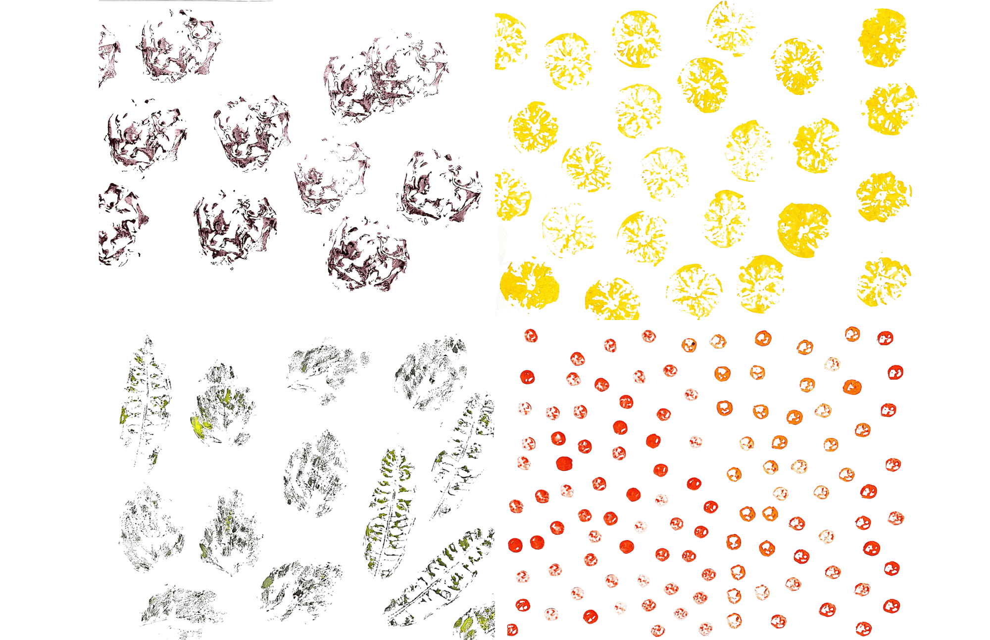 Hand prainted, pressed, and paint real fruits and vegetables to test the pattern and color.